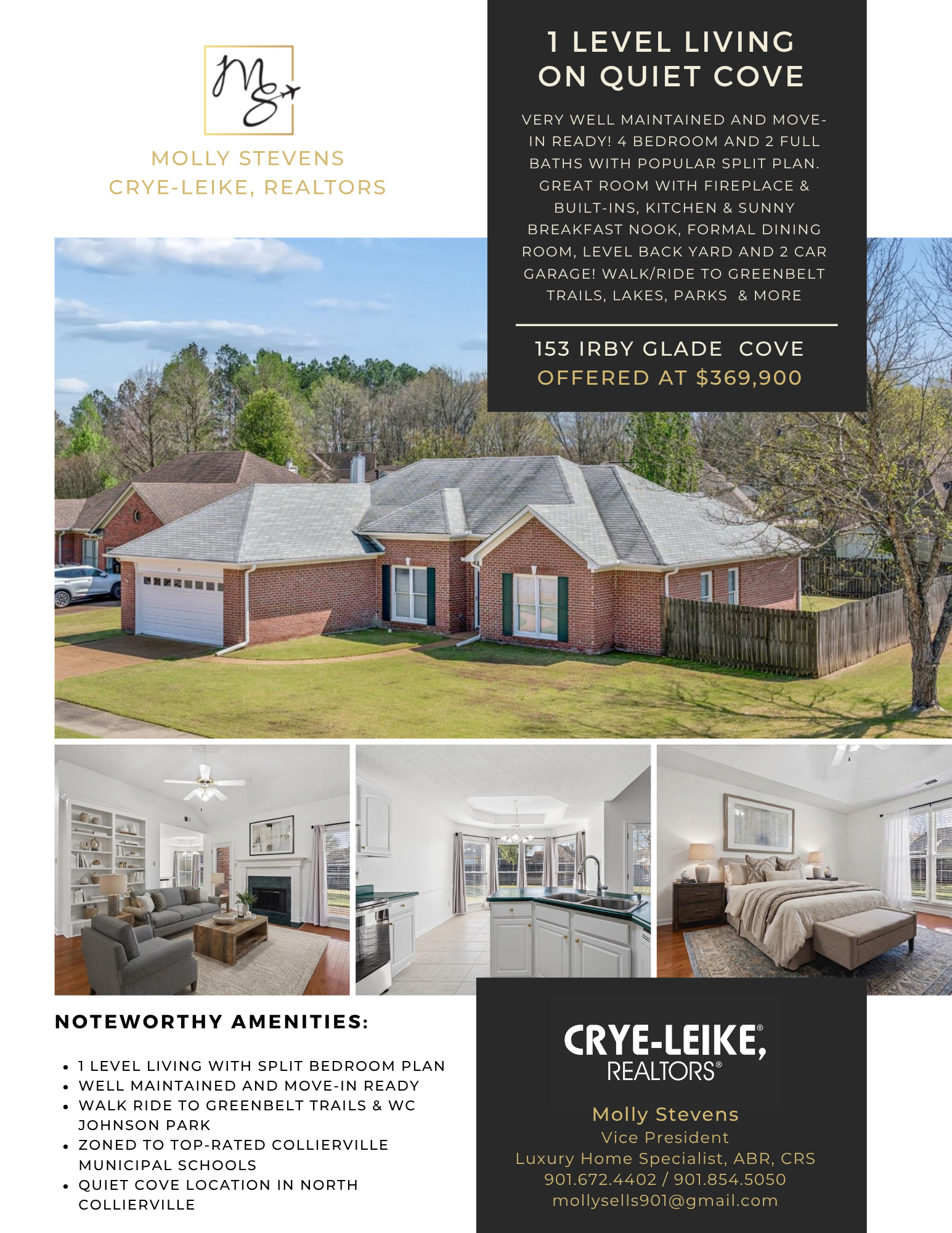 Welcome to 153 Irby Glade Cove. a 4 bedroom, 2 full bathroom gem tucked away at the end of a quiet Collierville cove, offering the perfect blend of privacy and convenience. THe greenbelt trail is just around the corner and exciting WC Johnson Park, is just minutes away letting you enjoy trails, lakes, parks and outdoor spaces whenever the time is right. This very well maintained one level brick home offers a split bedroom plan and features an open, light-filled layout with built-ins and a cozy fireplace - perfect for hosting friends or relaxing after work. The kitchen offers ample prep space and a bright breakfast area that overlooks the level backyard. The primary suite includes a large bathroom and walk-in closet, while 3 additional bedrooms flex for a home office, gym or guest space - whatever fits your lifestyle. Outside, enjoy a patio and fenced yard ideal for entertaining, pets, or evening/weekend downtime. A front load, 2 car garage adds storage and ease. Zoned for highly rated Collierville schools, this home delivers space, flexibility, and an ideal and quiet connected location that's close to everything you'll need and definitely hard to beat.